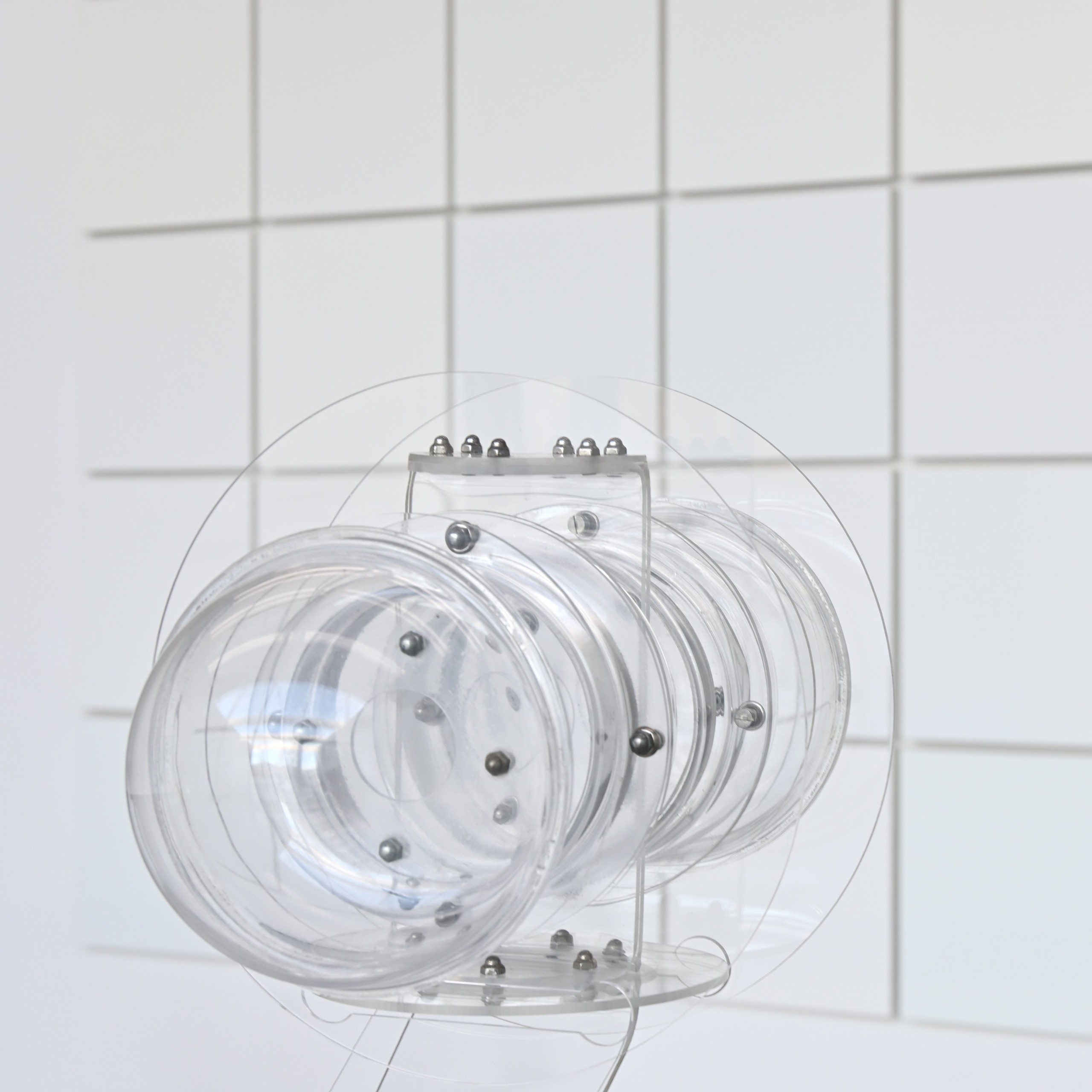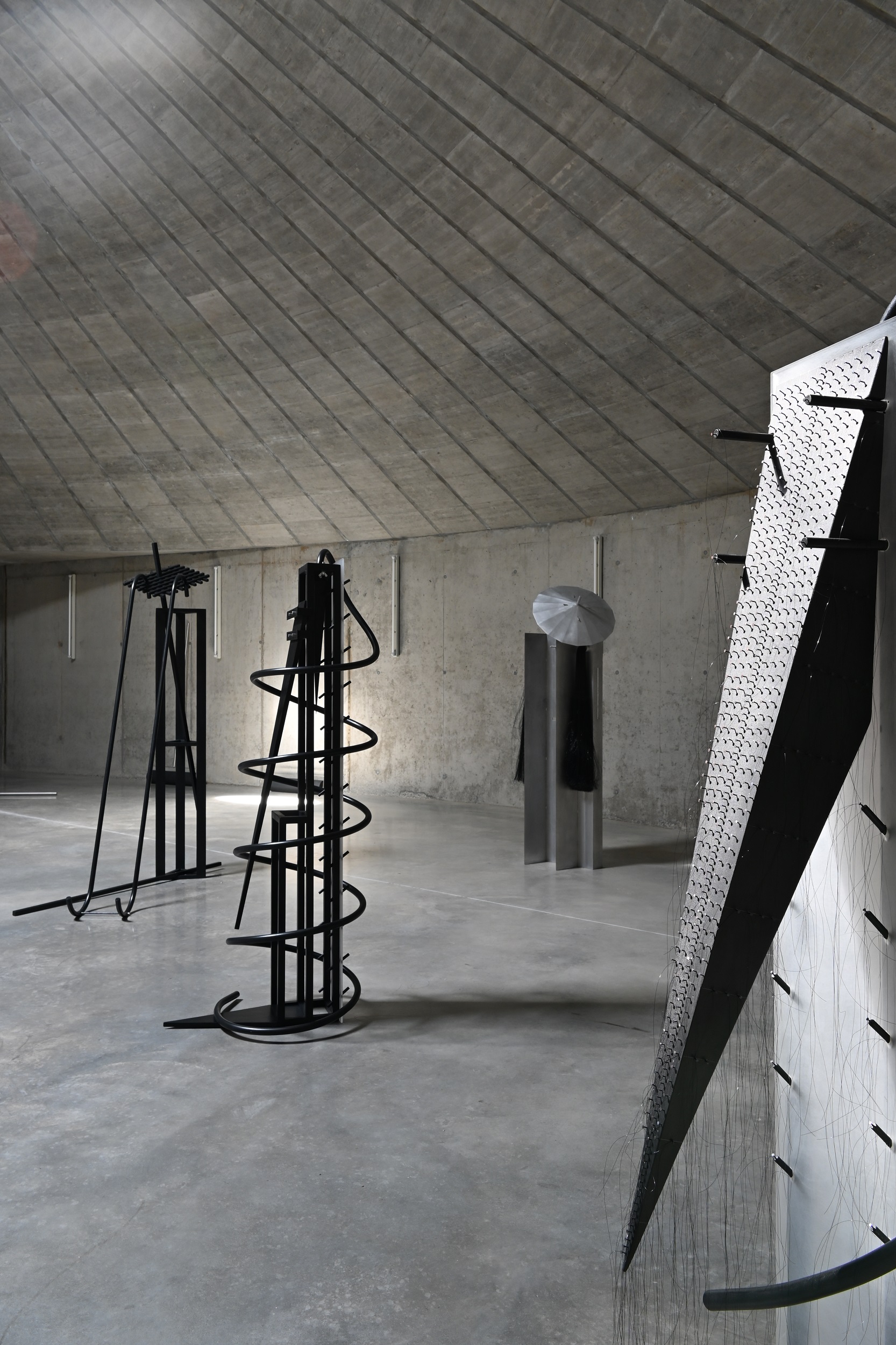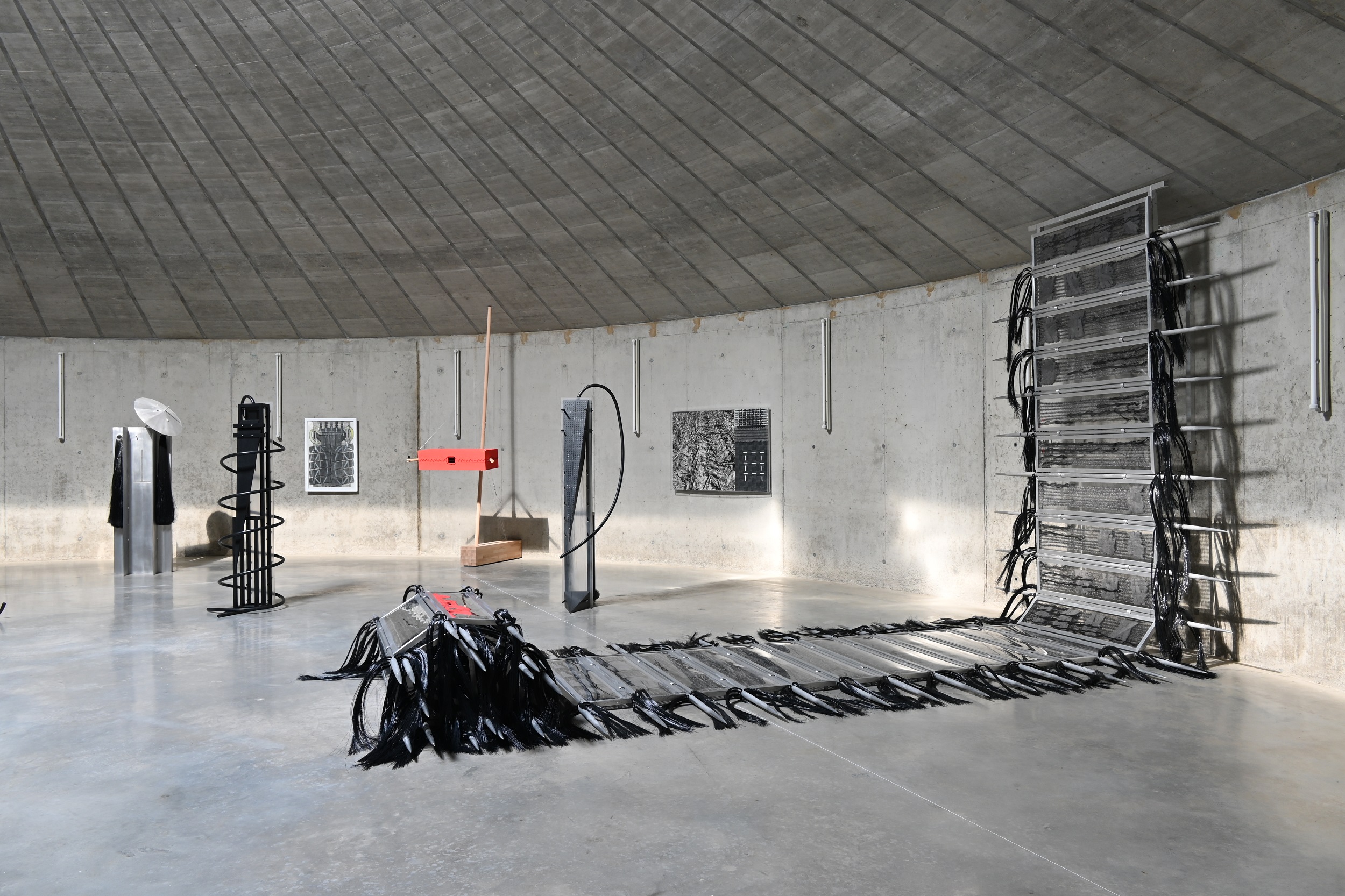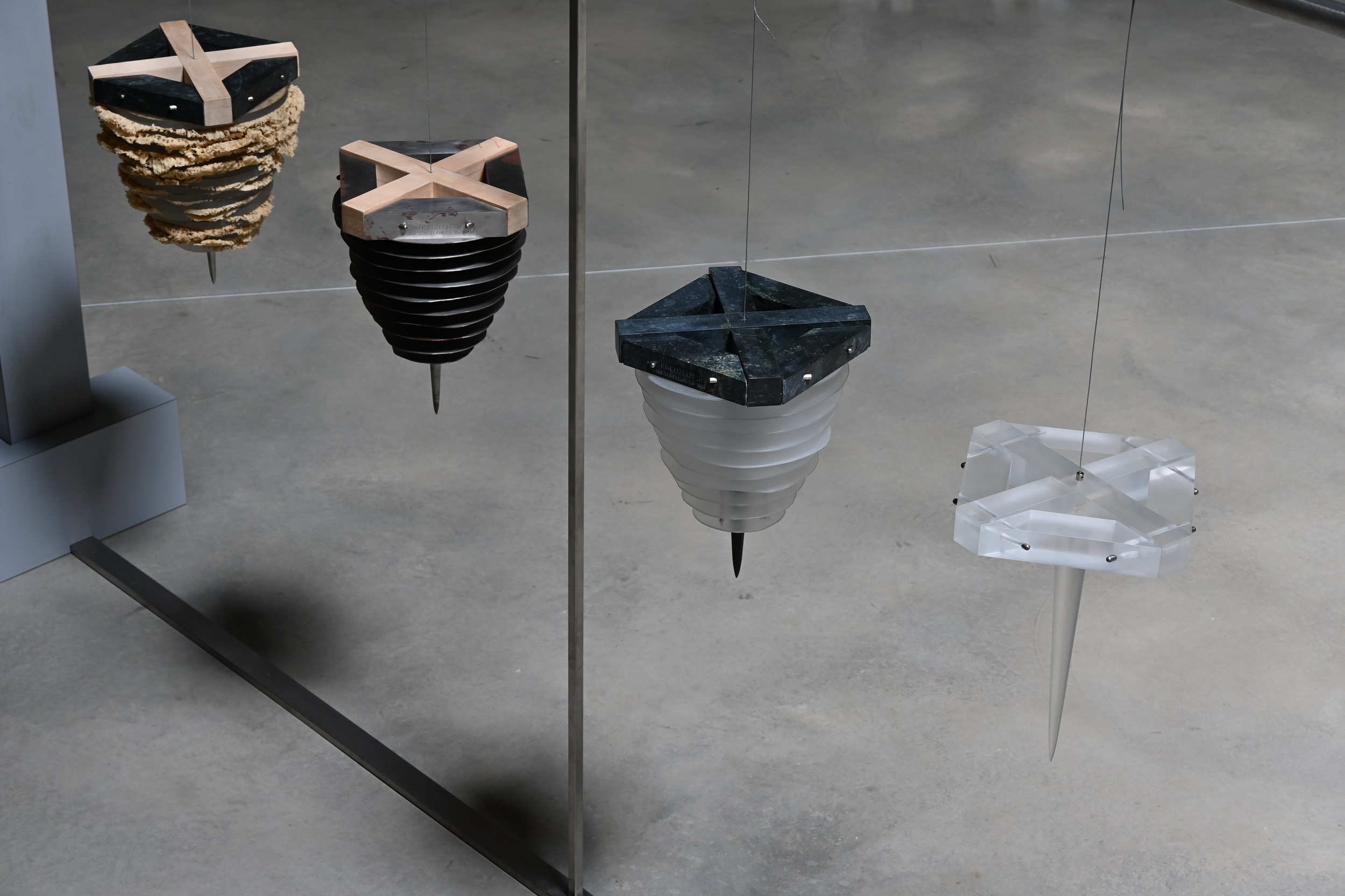 Neben Hauptwerken der 1970er-, 1980er- und 1990er-Jahre wie KREUZLOT 1-4 (1978/82/98), der RAUM-FIGUREN ZETA (1999–2003) und ETA (1999–2004) nahm Schellander eine Neu-Interpretation der seit 1991 unvollendeten ADD. LIN. FRE. 17 vor und überrascht mit der 2023 dekonstruierten EINHEITENFUGE 7: Padua-x (1984/85). Neben Collagen und Zeichnungen sind vier der neun Kopfergänzungen Teil von Schellanders Orchestrierung des Skulpturendepots, ausgehend von Kopfergänzung A: KALOTTE (1973). Die Figuren OMIKRON (1991, 2016/24) und LAMBDA (1991, 2016/24) wurden im Zuge des Ausstellungsaufbaus im Frühjahr 2024 direkt vor Ort fertiggestellt und drei der vier Eckpositionen des imaginären weiß konturierten Quadrats entstanden als neue, für den Raum konzipierte Werke.